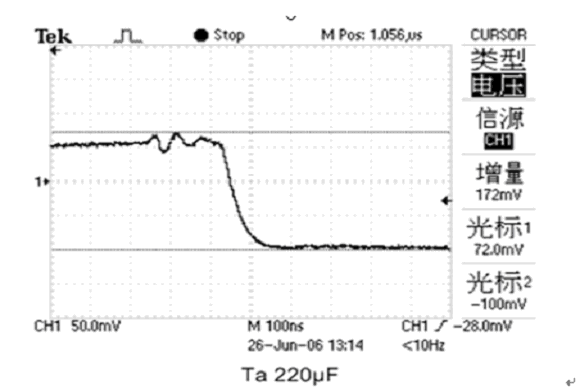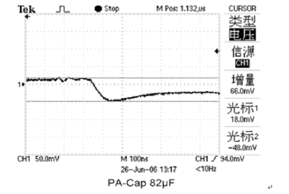 當MPU的負載電流急劇增大時,由于PA-Cap的ESR比普通鉭電容小很多,所以接上PA-Cap的電源電壓下降只有66mV比普通鉭電容小好幾倍(如圖10、11所示),達到良好的去耦效果。PA-Cap不僅去耦效果好,而且不燃燒不爆炸,是MPU等數字電路作為高速保護備用電荷庫的優選電容之一。