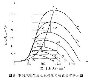 風(fēng)力機(jī)通過葉輪來捕獲流動的風(fēng)能,風(fēng)的能量轉(zhuǎn)化為葉輪旋轉(zhuǎn)的動能,齒輪箱再把這種機(jī)械能傳輸?shù)桨l(fā)電機(jī),由發(fā)電機(jī)通過內(nèi)部的電磁關(guān)系將機(jī)械能變?yōu)殡娔茌敵觥D5為在不同風(fēng)速下,葉輪轉(zhuǎn)速與風(fēng)力機(jī)輸出功率的關(guān)系圖。由圖可知,對應(yīng)于每個風(fēng)速的曲線,都有一個最大輸出功率點,風(fēng)速越高,輸出功率越高,相應(yīng)的葉輪轉(zhuǎn)速也越高。因此,如果能隨風(fēng)速變化改變?nèi)~輪轉(zhuǎn)速,使得風(fēng)力機(jī)在所有風(fēng)速下都工作于最大功率輸出點,則發(fā)出電能最多,否則發(fā)電效能將降低。