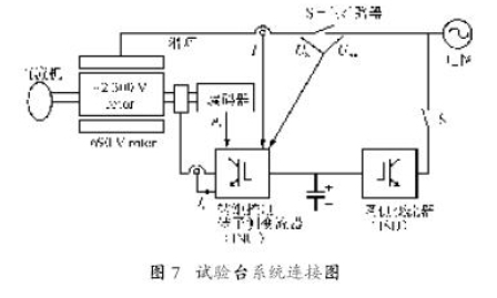 上海南洋電機(jī)廠采用ACS800-67 變頻器構(gòu)建雙饋風(fēng)力發(fā)電機(jī)的實驗平臺,風(fēng)力機(jī)采用直流電動機(jī)模擬,即雙饋發(fā)電機(jī)轉(zhuǎn)子靠直流電動機(jī)拖動。系統(tǒng)連接示意圖如圖7所示。技術(shù)數(shù)據(jù)如下:發(fā)電機(jī)定子額定電壓690 V,定子額定電流1500A,額定頻率50 Hz,額定功率1 345kW,額定轉(zhuǎn)速1 513 r/min,同步轉(zhuǎn)速1 500 r/min,功率因數(shù)0.9,轉(zhuǎn)子開路電壓1990V,轉(zhuǎn)子電流550A;變頻器型號ACS800-67-0480/0770-7,調(diào)速范圍±30%。