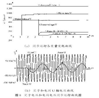 圖8(b)所示為電網(wǎng)U 相電壓與定子U 相電壓在同步過程中的變化曲線。由圖可知,當(dāng)變頻器投入運行后,定子U 相電壓迅速建立,并與電網(wǎng)U 相電壓在相位、幅值上完全一致,達(dá)到同步的要求。