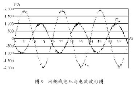 圖9 為發(fā)電機(jī)處于超同步運行(轉(zhuǎn)子轉(zhuǎn)速為1 513 r/min),給定轉(zhuǎn)矩為額定轉(zhuǎn)矩的85%,無功功率給定為零時,電網(wǎng)線電壓、相電流的波形圖。理論分析可知,當(dāng)發(fā)電機(jī)處于超同步運行狀態(tài),發(fā)電機(jī)的定子側(cè)和轉(zhuǎn)子側(cè)應(yīng)同時向電網(wǎng)輸出電能,網(wǎng)側(cè)相電流為定子與轉(zhuǎn)子的電流之和。通常網(wǎng)側(cè)變流器的無功功率給定設(shè)置為零,所以定子與轉(zhuǎn)子電流的相位相同,都與電網(wǎng)電壓反相。實際上,由圖可知,電網(wǎng)相電壓與定子電流相位相差180°,完全反相,發(fā)電機(jī)處于發(fā)電狀態(tài),向電網(wǎng)輸出電能,功率因數(shù)為-1。