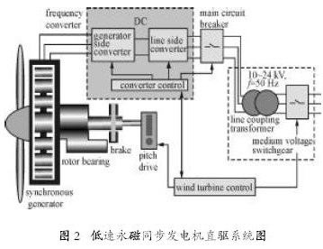 對數(shù)為200,很難實現(xiàn),因此該方案必須使用升速齒輪箱,配高速異步電機(jī)(通常采用6極電機(jī))。升速齒輪箱速比大,負(fù)荷重,隨風(fēng)速變化波動大且頻繁,造價高、易疲勞損壞是該方案的主要缺點,另外繞線式異步電機(jī)的電刷和滑環(huán)也會影響系統(tǒng)的可靠性,增加維護(hù)工作量。