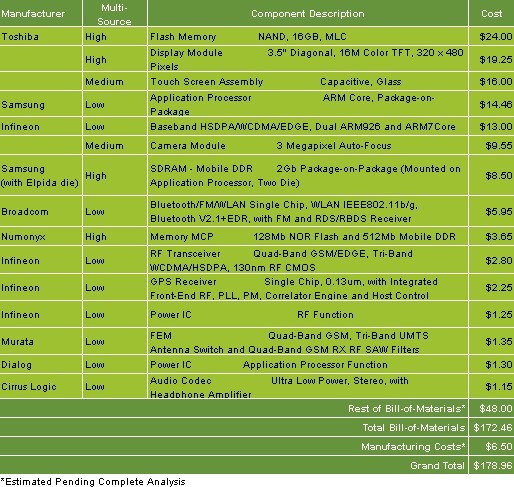 - iSuppli拆機分析iPhone 3G S的材料及制造成本為178.96美元