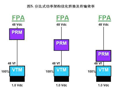 由于VTM負責在負載點變壓,它的K比值最高可達到200,分比母線因此無須受負載電壓限制,可設定在任何一點上,甚至可把分比母線設定跟電源電壓相同。如圖5,負載電壓是1V,分比母線可設定為48V,完全不受負載電壓或PRM與VTM的距離影響,不需在輸送損耗與轉換損耗中折沖取舍。重點是FPA把變壓的部份放在負載點,克服了IBA面對的難題,占空比可達100%。