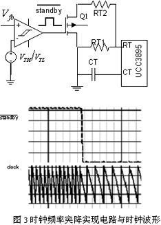 突降實現(xiàn)方法如圖3:以UCC3895為例,當電源處于正常負載狀態(tài)時,Q1導通,其時鐘周期為:
