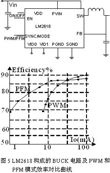 對于額定功率時工作在PWM模式的開關(guān)電源,,也可以通過切換至PFM模式提高待機效率,即固定開通時間,調(diào)節(jié)關(guān)斷時間,負載越低,關(guān)斷時間越長,工作頻率也越低。圖5是采用NS公司的LM2618控制的Buck轉(zhuǎn)換器電路和分別采用PWM和PFM控制方法的效率比較曲線。由圖可見,在輕載時采用PFM模式的電源效率明顯大于采用PWM模式時的效率,且負載越低,PFM效率優(yōu)勢越明顯。