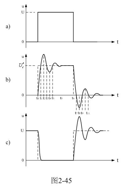 當(dāng)開關(guān)管Q1導(dǎo)通過(guò)后,開關(guān)管開始關(guān)斷,相當(dāng)于輸入脈沖電壓的上升率為負(fù)(脈沖進(jìn)入反沖階段),此時(shí),輸入脈沖電壓的上升率小于串聯(lián)振蕩回路自由振蕩電壓的上升率,因此,振蕩回路又開始再次釋放能量,振蕩回路再次產(chǎn)生阻尼振蕩,如圖2-45所示。