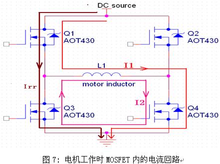 延長MOSFET的開通時間可以減小開通時的涌入電流。由于電機負載為感性負載,所以在PWM關斷時存在續(xù)流現(xiàn)象(見圖7中的I2),為了減小續(xù)流側反向恢復電流(Irr)的大小,PWM側開關管的開通速度不宜過快。由于MOSFET處于飽和區(qū)時有公式:Id=K*(Vgs-Vth)2,(K為一常數(shù),由MOSFET的特性決定)。所以在一定的溫度和Vds條件下,從MOSFET的門極驅動電壓Vgs可以判斷MOSFET中的電流大小。圖5中Vgs峰值為9.1V,圖6中Vgs峰值為6.4V,所以增加電容使得峰值電流減小。Id也可從MOSFET的轉移特性圖中獲得。