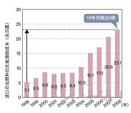 圖中顯示日本進口的化石燃料衍生能源。圖由是AIST的櫻井和環境部依據金融貿易統計而制。