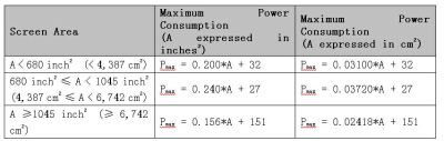 從功耗角度來看,ENERGYSTAR(EPAV3.0)已經(jīng)明確規(guī)范電視產(chǎn)品的最大功耗,這一標(biāo)準(zhǔn)將于2008年11月1日正式生效。在EPAV3.0規(guī)范中電視產(chǎn)品允許的最大功耗與其尺