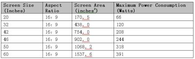 表2:根據(jù)ENERGYSTARV3.0標(biāo)準(zhǔn)計算各尺寸LCDTV最大允許功耗。