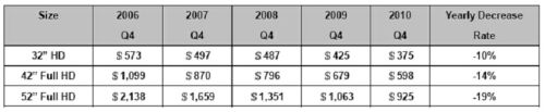 表3:DisplaySearch對LCDTV成本的近年數(shù)據(jù)統(tǒng)計及未來走勢預(yù)測。