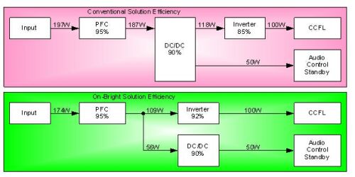 圖6以150WLCDTV電源為例來對比傳統(tǒng)方案與昂寶電子方案,假設(shè)背光滿載消耗100W,其它部分滿載消耗50W,按照常規(guī)架構(gòu)及各模塊轉(zhuǎn)換效率來推算,運用傳統(tǒng)方案來設(shè)計,其理論輸入功率將達到197W左右,整體效率為76%,而使用昂寶電子的方案來設(shè)計,理論輸入功率只需要174W左右,整體效率高達86%。