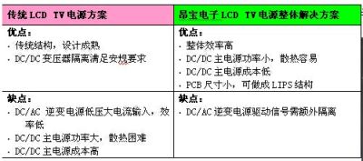表4:傳統(tǒng)LCDTV電源方案與昂寶電子方案優(yōu)缺點的比較。