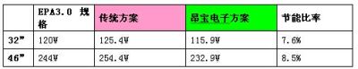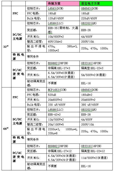 以某知名品牌32"與46"LCDTV進行對比,昂寶電子所開發(fā)的LCDTV整體電源解決方案在整體功耗及關(guān)鍵零件數(shù)量方面均比傳統(tǒng)電源方案有明顯的優(yōu)勢: