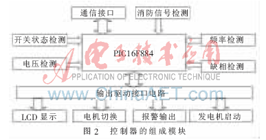 智能型雙電源開關控制器以單片機PIC16F884為核心,對兩路供電電源(常用電源和備用電源)的電壓、頻率和相位進行實時檢測。當其中一路電源(常用電源或備用電源)的電壓發生過壓、欠壓或是缺相時,控制器就會發出電機切換命令,使供電電源自動切換到另一路電源(備用電源或常用電源)上,以此來保障供電的連續性。控制器的工作方式主要有自動方式和手動方式兩種。控制器的結構框圖如圖1所示,組成模塊如圖2所示。