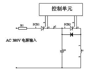 控制原理是:首先通過380V交流電給C1充電,正半周SCR1導(dǎo)通,完成充電過程,負半周SCR1自動截止,C1電壓一直保持到下一個正半周期信號到來。此時開通SCR2,使C1、L1形成回路,產(chǎn)生自由震蕩并完成放電。如此反復(fù)循環(huán),即達到了理想的磁場波形。