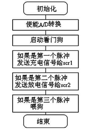 圖5是主程序流程圖。由于電路中的可控硅觸發(fā)時間要求嚴格,所以,程序中分別使用了定時器T0作為SCR1充電的觸發(fā)定時信號,定時器T1作為SCR2放電時間的定時信號。