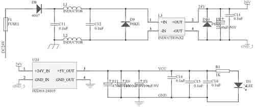 本控制模塊的電源電路如圖2所示。車載蓄電池—發電機的電源從24V_1處進入,二極管D16主要是防止電源的正負極被誤接反。電感L1、L2對電源進行濾波,和共模電感L3、電容C8配合,可以過濾掉電源中的尖峰脈沖。二極管D24P6KE51A是脈沖干擾抑制器(TVS),它可以快速吸收超過額定電壓的尖峰脈沖,瞬時通過電流很大,最大功率可達500~1000W。電容E5和C9進一步對電源進行濾波。過濾干凈的電流通過開關電源芯片LM2576變換為系統使用的5V電源。電容E7和C11對輸出5V電源進行濾波,電阻R18和發光二極管D28指示當前是否有電。