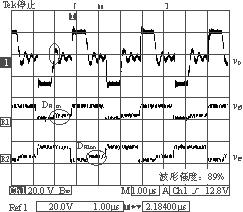 IM-CDR結構選擇如圖1(c)所示的拓撲。從結構上可以看出,磁芯的3個磁柱上都加了相同的氣隙(lg),這必然會導致變壓器原邊的漏感(Lk)的增大,但可以利用變壓器原邊漏感中的能量實現副邊同步整流管的自驅動(開通),同步管的關斷是通過外加驅動信號來完成的。實驗電路如圖2所示,由圖2可以看到副邊同步管的驅動電路包括一個繞組(Na),兩個二極管(Da1,Da2)和兩個MOS管(Sa1,Sa2),它的實現比較簡單,只需要在磁芯的中心磁柱上多加一組繞組即可。變壓器原邊采用的是對稱半橋拓撲。實驗電路的具體參數見表1所列。實驗波形圖如圖3和圖4所示。圖3是在負載電流Io=4A時測得的變壓器原邊電壓波形以及兩個同步整流管的門極驅動電壓波形圖。由于此時的負載電流較小,反映到變壓器原邊的激磁電流也較小,在原邊開關管關斷的瞬間,變壓器原邊漏感(Lk)與開關管輸出結電容(Co1,Co2)間的振蕩尖峰不夠高,不足以開通副邊的同步整流管。