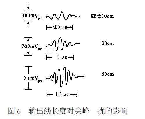 為減小輸出線上的損耗和尖峰干擾,輸出到負載的連線應短。圖6畫出了對三種不同長度的輸出線,當負載電流為8A時,在負載端所測得的干擾波形。輸出線長,尖峰干擾的幅度大、寬度也寬。相同長度的輸出線,線徑粗則尖峰干擾幅度大、寬度寬。用雙絞線能有效地衰減電磁感應電勢,表1說明對感應電勢衰減的數值隨扭距變短而增大。