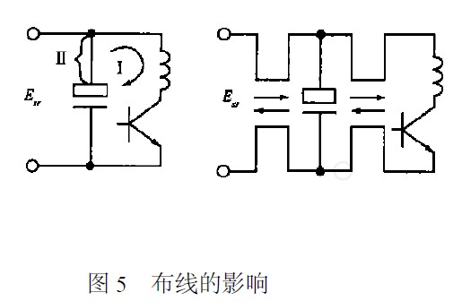 流過開關大電流的導線應盡量短,并且不跟其它線交連。降壓型開關穩壓電源的續流二極管或者升壓型的開關三極管的接地端應以最短的引線直接與輸出電容的地端相連。圖5表示了布線的影響,尖峰干擾通過環路I輻射,故構成這一環路的各段連線的感性耦合必須最小,電容器的引線要短,以減小引線電感。