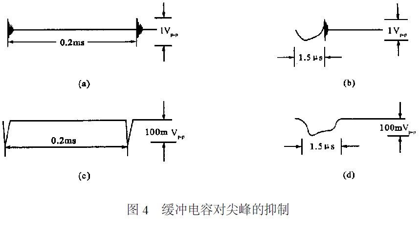 在開關三極管的CE之間,或者在續流二極管的兩端并聯RC緩沖電路可使尖峰干擾明顯減小。圖3中,三極管T關斷時,集電極電壓上升,通過D和R1對C充電,使其上升速率變緩,選擇充電常數CR1的值可以控制上升速率。T導通時,D截止,C對R1和R2放電,限制了導通瞬間的峰值電流。該緩沖電路改變了負載線的形狀,減少了開關三極管的損耗。在續流二極管兩端并上RC電路也同樣有效。圖3中,當用3DD11和2CK120C時,可并0.022LF左右的電容器(f=2kHz),該電容的容量有一最佳值,它的作用可以從圖4看出。圖4(a)是不加C的情況,將其在時間軸上放大后為圖4(b)。并上緩沖電容后分別見圖4(c)和(d)。