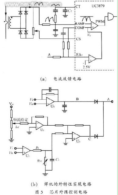 (2)外拖特性實現 正常工作時,輸出電壓反饋值Vfb大于外拖給定值Vz,比較器U3的輸出為零,對加法器U4沒有影響,焊接電流由恒流給定值Iref決定;當焊槍與工件粘連短路時,Vfb小于VZ,比較器U3的輸出為高,相當于給增大了Iref,UC3879內部誤差放大器的輸出Ve也增大,焊接電流則隨之增大,從而實現外拖。
