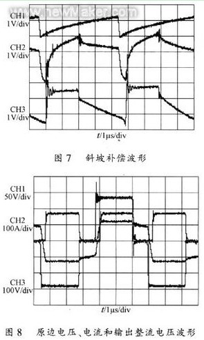圖7為電流斜坡補償波形。通道3為原始電流采樣波形;通道1為用于補償的鋸齒波;通道2為補償后波形。補償后斜率明硅增加。 圖8所不為原邊電壓(通道3)、原邊電流(通道2)和輸出整流電壓(通道1)波形。從圖8中可清楚地看出占空比損失。