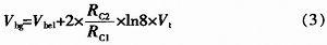 其中I是三極管射極電流,Is與射極面積成正比,n為一常數,取1。這里,取VQC2:VQC1=8:1,因此Is2=8xIs1,又I1=I2,分別代入(1)并相除,整理得: