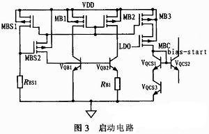 這樣雖然能啟動,但是,正常工作時,此大啟動電流bias-start將通過VQCS1和VQCS3流向地,增加了系統的負擔。因此,在電流輸出管MB3下加入控制管MBC,并使得在正常工作時,LDO的高電壓足以使MBC關斷,從而降低啟動電路的損耗。