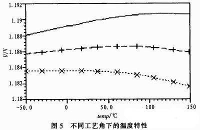 圖5為不同工藝角下的溫漂仿真。仿真結果表明,此電路可以達到ref-45 ppm、bg-7.5 ppm的低溫漂。實際電路存在器件的不匹配和誤差等,雖然達不到理論上的溫漂,但通過仔細布版、修調帶隙核心電路中Rc1、Rc2,可以達到較低的溫漂。