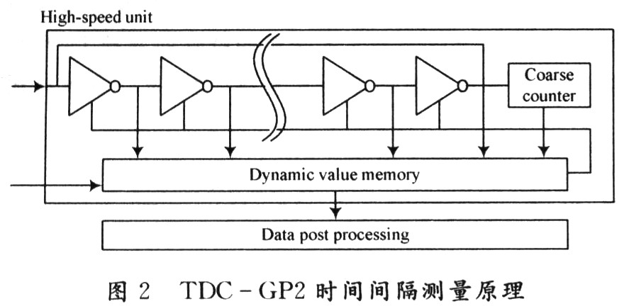 該系統(tǒng)主要由脈沖產(chǎn)生器、數(shù)據(jù)處理單元、時間數(shù)字轉(zhuǎn)換器、溫度測量單元、時鐘控制單元、配置寄存器以及與單片機(jī)相接的SPI接口組成。在實際應(yīng)用中,由于TDC-GP2的功耗很低,使得TDC-GP2的輸入/輸出電壓(工作電壓)為1.8~5.5 V,核心電壓為1.8~3.6 V,所以可以采用電池供電,使用方便。同時單片機(jī)由4線的SPI接口相連,可以把TDC-GP2作為單片機(jī)的一個外圍設(shè)備來操作。通過內(nèi)部ALU單元計算出時間間隔,并將結(jié)果送入結(jié)果寄存器保存起來。通過對TDC-GP2內(nèi)部寄存器的設(shè)置,可以多次采樣并將結(jié)果保存。TDC-GP2是基于內(nèi)部的模擬電路測量“傳輸延時”來進(jìn)行的,是以信號通過內(nèi)部門電路的傳播延遲來進(jìn)行高精度時間間隔測量的。TDC-GP2時間間隔測量原理如圖2所示。