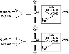 通過(guò)檢測(cè)RC網(wǎng)絡(luò)中C兩端的電壓,作為電流信號(hào),幾路電流信號(hào)(本例只有兩路)通過(guò)一個(gè)相同的電阻就得到了平均值均流母線,平均值均流母線電壓值與負(fù)載有關(guān),表征負(fù)載電流的大小。然后將每路采樣來(lái)的電流信號(hào)與母線電壓比較,得到誤差信號(hào),去修正輸出電壓參考信號(hào),從而對(duì)PWM控制器的占空比輸出進(jìn)行微調(diào),達(dá)到均流和穩(wěn)壓的目的。