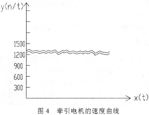 利用 STEP7 編制PLC 上位機(jī)監(jiān)控程序,Wincc采集速度值并繪制曲線。數(shù)據(jù)提取的時(shí)間間隔為15ms。實(shí)際上牽引電機(jī)1 和牽引電機(jī)2 速度是相同的, 但為了反映牽引電機(jī)2 的跟蹤和波動(dòng)情況, 在此特地將其分開, 上面是牽引電機(jī)1 的速度曲線, 下面是牽引電機(jī)2 的速度曲線(見圖4) 。牽引電機(jī)1 的速度發(fā)生變化時(shí), 牽引電機(jī)2 就能及時(shí)地響應(yīng), 進(jìn)行跟蹤, 并且能很快地達(dá)到穩(wěn)定。實(shí)驗(yàn)表明, 采用PLC 和變頻器的控制方法, 能達(dá)到較高的同步要求, 響應(yīng)快、速度波動(dòng)幅度較小。