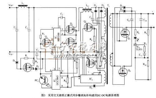 圖 3所 示 為采用交叉級聯正激變換電路設計的通信設備專用DC-DC半磚電源原理圖。工作原理如下,R,, R2. D,, Q,, D:和C:組成自舉啟動電路,得到啟動電壓Vc分別給ICI,I C2和IC3供電。電路啟動后,T,的輔助繞組經D3整流,C3平滑濾波后為IC提供電壓VD,因VD電壓高于Vc,二極管D2反偏,Q、的供電關閉,達到啟動電路無功耗的目的。IC:的腳6輸出方波信號,一路直接送到ICl的腳5,另一路經Q2倒相后送到IC:的腳6作為IC,的輸入信號。IC,的腳3和腳8輸出相位相差180“的方波脈沖信號,分別驅動MOSFETQ 31 Q 4- Q3" Q 4" L 2等組成高效率的同步降壓級,降壓級的占空比保持在30-60%. IC3.Qs"Q6"T.等組成交叉級聯正激式隔離級,達到DC-DC最終的輸出電壓。馬、DS為變壓器T,的磁復位繞組。由于降壓級已將變化范圍較寬的輸入電壓嚴密調整為中間總線電壓,因此隔離級不需調壓。交叉級聯正激變換器都工作在50%的占空比,可以采用VDS為100V的MOSFET. Q7, Q:等組成自偏置式同步整流電路,因隔離級的輸出電壓是固定的,所以同步整流MOSFET漏極的輸入電壓也是固定的,占空比也為50%,可以使用VDS很低的MOSFET(本例中采用的是VDS為12V的MOSFET,損耗最低)因功耗引起的發熱問題均可以方便解決。因輸入電壓固定,多出電壓時,能夠方便地實現高電壓調整率和高負載調整率,單級變換器很難做到此點。其他電路功能(如過流、過壓、過溫度保護等)不再一一闡述。經測量該電路的工作效率約在92%左右,達到預定的設計要求,并且調試較簡單,為今后的批量生產奠定了基礎。