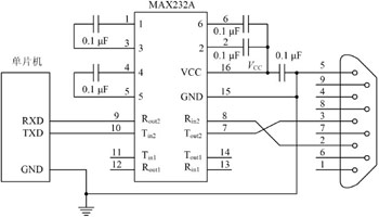 串口是計算機上一種非常通用設備通信的協議,大多數計算機包含2個基于RS232的串口,PC的串行口是RS232C電平,而單片機的串行口是TTL電平,兩者之間通過串口通信時,必須進行電平轉換,設計運用MAX232A芯片完成單片機與PC之間的數據傳輸,硬件連接電路如圖6所示。