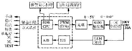 系統(tǒng)工作在開(kāi)環(huán)狀態(tài),利用8098的PWM口,經(jīng)濾波后輸出一個(gè)0~5V的控制電壓信號(hào)給觸發(fā)板,使整流橋相應(yīng)輸出電壓為0~300V.該方式主要用于系統(tǒng)主電路的檢修和維護(hù)。