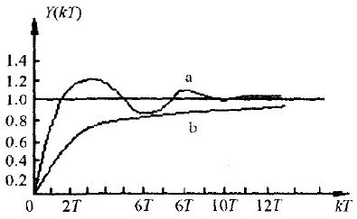 恒偏差法和有效偏差法相類(lèi)似。有效偏差法又叫逆算法。即當(dāng)控制量Uk越限時(shí),Uk取邊界值Umax或Umin.由該邊界值逆算出偏差值Ek''代替原來(lái)的偏差值Ek.然而,在恒偏差法中,是用經(jīng)過(guò)衰減后的Ek''去代替Ek.系統(tǒng)在階躍響應(yīng)時(shí),實(shí)際工作在過(guò)阻尼狀態(tài),從而減緩了在起、停時(shí)對(duì)主電路器件的沖擊。圖3示出兩種算法的階躍輸入響應(yīng)曲線(xiàn)。其中曲線(xiàn)(a)標(biāo)準(zhǔn)PI算法響應(yīng)曲線(xiàn)、曲線(xiàn)(b)恒偏差法響應(yīng)曲線(xiàn)。
