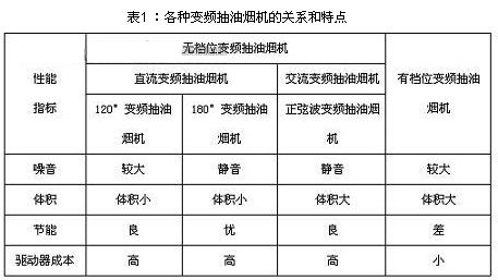 抽油煙機變頻的目的是為了通過調整抽油煙機上的帶動風扇的電機轉速,進而根據油煙量的大小調整油煙抽吸的快慢。優良的調速和節能效果使得變頻抽油煙機在性能上明顯優越于傳統的抽油煙機,而變頻抽油煙機根據具體的變頻技術有不同的分類和性能特點,如表1所示。