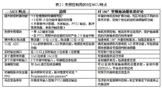 此外,這些MCU還具有帶2個自由中斷專用變頻控制模塊,以在PWM周期的任意時刻產生中斷,根據用戶需要的任意時刻對電流進行采樣;專用于控制 PWM高阻態輸出的獨立外部信號輸入,可在非正常情況下快速停止風扇的轉動;以及8位的可編程死區控制(死區時間范圍:0.1 s~25.6 s)等。圖2顯示了8位變頻控制MCU的主要特點,表2則這些功能給出了詳細說明。