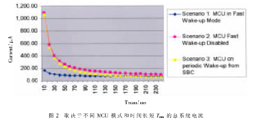 為了證明采用這種方法能夠節約電源,對現實生活中的實例進行了評估。圖2顯示了普通系統基礎芯片(SBC)系統電流和S12X 車門系統電流在不同喚醒方法和圖1中顯示的時間參數: