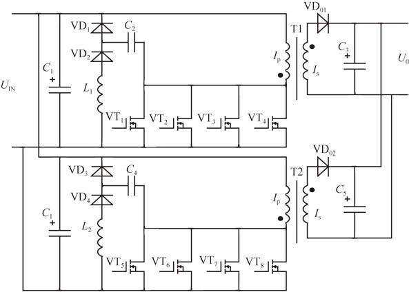 如圖2所示,該電路的特點是,主功率電路采用4只功率管并聯,每只功率管通過的電流為單管應用時的1/4(假定4只功率管參數一致),則功率管的導通壓降也應為單管應用時的1/4.根據計算,在輸出550W時,理論上,4管并聯比單管可減小通態損耗約20W,提高效率近3個百分點。