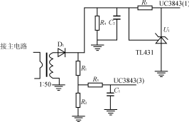 電流反饋電路采用電流互感器檢測(cè)開關(guān)管上的電流,原理如圖2所示。電流互感器的輸出分為電流瞬時(shí)值反饋和電流平均值反饋兩路,R2上電壓反映電流瞬時(shí)值,開關(guān)管上的電流增大會(huì)使UR2增大,當(dāng)UR2大于1V時(shí),UC3843芯片輸出脈沖關(guān)斷。調(diào)節(jié)R1、R2分壓比可改變開關(guān)管的限流值,實(shí)現(xiàn)電流瞬時(shí)值的逐周期比較,這屬于限流式保護(hù)。輸出脈沖關(guān)斷,實(shí)現(xiàn)對(duì)電流平均值的保護(hù),這屬于截流式保護(hù)。兩種過(guò)流保護(hù)互為補(bǔ)充,使電源更為安全可靠。采用電流互感器采樣使控制電路與主電路隔離,同時(shí)與電阻采樣相比降低了功耗,有利于提高整個(gè)電源的效率。