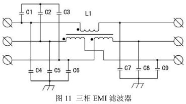 在電源電纜上的干擾具有共模和差模電流分量,在IGBT逆變焊機中共模干擾是主要治理對象,圖11是一種共模、差模兼顧的三相EMI濾波器。C4~C9、L1主要用于共模干擾的濾出,L1的漏抗和C1~3用于差模干擾的濾出。
