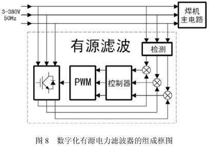有源濾波器原理如圖 8 所示。通過檢測電路對負載端(焊機主電路)的電壓、電流進行檢測,然后送入控制電路進行計算分析,輸出相應(yīng)的脈沖驅(qū)動 IGBT,產(chǎn)生與負載電流中的諧波電流大小相等方向相反的電流,從而達到補償負載電流中的諧波分量和無功功率的目的。逆變器工作時所需要的能量由儲能電路供給,該儲能電路是通過逆變器中的各個 IGBT 的反并聯(lián)二極管進行充電,同時又在 IGBT 開通時輸出能量,使諧波電流分量和無功功率得到補償。這樣,電網(wǎng)的輸入電流可實現(xiàn)為正弦波形。 有源濾波器動態(tài)響應(yīng)迅速,濾除諧波可達到 95%以上,補償無功細致。但有源濾波器由于電路復(fù)雜,材料成本高,運行可靠性也不及無源濾波電路,對市場價格競爭異常激烈的 ZX7、NB 系列逆變焊機而言不太適用,但對需要作精細控制的數(shù)字化焊機而言,可能有源濾波才是其最佳選擇。