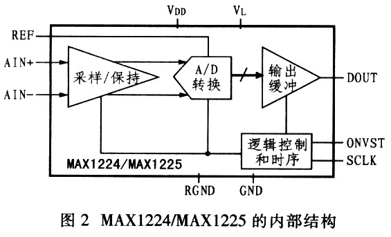 MAX1224/MAX1225采用輸入采樣,保持和逐次逼近寄存器(SAR)電路,將模擬輸入信號轉(zhuǎn)換為12位數(shù)字輸出信號。串行接口僅需要3條連接線(SCLK、CNVST和DOUT),提供了與微處理器(μP)和DSP的便利連接。圖2給出簡化的MAX1224/MAX1225內(nèi)部結構。
