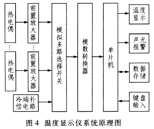根據(jù)以上要求,筆者在溫度顯示儀的設計中以AT89C51型單片機為核心,采用MAX1224型12位串行A/D轉(zhuǎn)換器構成采樣模塊進行電路設計。溫度顯示儀的主要功能是完成實時溫度循環(huán)顯示功能,它主要用于工業(yè)現(xiàn)場中的加熱爐及具有較高溫度的場合,它的測溫范圍是O℃~1200℃,誤差要求小于±5℃。所設計的溫度顯示儀要求具有4路溫度檢測通道,由熱電偶采集現(xiàn)場溫度,并由冷端補償電路進行補償,再由前置放大電路將檢測到的微小信號轉(zhuǎn)變?yōu)锳DC可轉(zhuǎn)換的信號。溫度顯示儀系統(tǒng)原理如圖4所示。