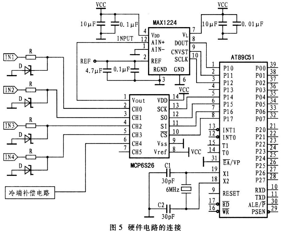 設計要求4路溫度檢測通道和l路冷端補償電路,所以本設計采用MCP6S26型6通道增益可編程放大器,該放大器特別適用于多路信號采集電路的設計,由于AT89C51單片機可以通過軟件對模擬信號電路進行控制,所以其適應性和靈活性大大提高。但是,由于AT89C51型單片機沒有3線制串行總線接口,它與MCP6S26進行3線制串行總線的連接時,要使用軟件來模擬3線制串行總線的操作,包括串行時鐘數(shù)據(jù)輸入和數(shù)據(jù)輸出。McP6S26與AT89C51的連接如圖5所示。圖中,P17模擬片選端CS,P14模擬時鐘輸入端SCK,P16模擬數(shù)據(jù)輸入端SI,P15模擬數(shù)據(jù)輸出端SO。