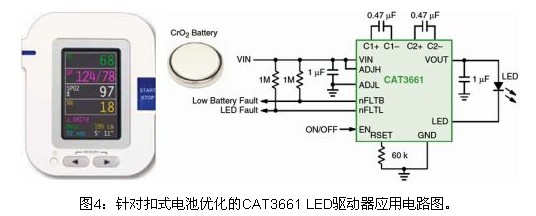 如今,越來越多的創(chuàng)新型便攜設(shè)備采用扣式電池(coin cell)供電,如醫(yī)療應(yīng)用中的血糖儀、數(shù)字體溫計、血氧計、呼吸分析儀和生理監(jiān)測儀等。由于這種電池的獨特特性以及需要長工作壽命,這些緊湊型應(yīng)用需要定制的LED驅(qū)動器,不僅要管理背光,還要監(jiān)測電池電量。在這類應(yīng)用中,可以采用安森美半導(dǎo)體計劃于2010年下半年推出的CAT3661 2至2.5 V單LED驅(qū)動器。這器件同樣采用安森美半導(dǎo)體專利的四模(Quad Mode)電荷泵架構(gòu),能效高達(dá)92%,靜態(tài)電流低至約150 μA,提供可調(diào)節(jié)的低電池電量檢測功能,以及強固的LED故障監(jiān)測、軟啟動和短路限制等保護(hù)功能,采用低高度的3 x 3 mm TQFN-16封裝,非常適合這些便攜設(shè)備應(yīng)用。